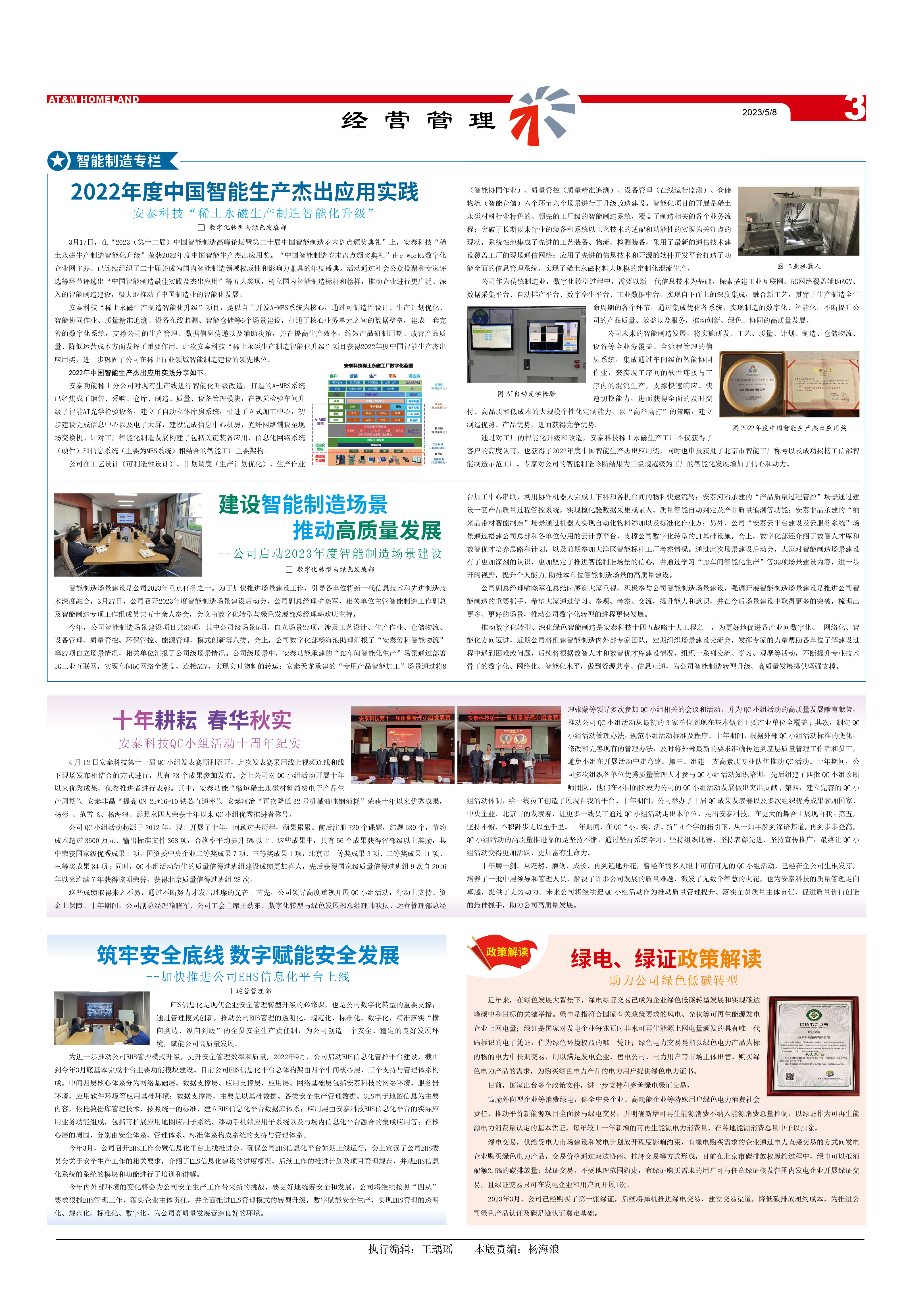 通過對工廠的智能化升級和改造,安泰科技稀土永磁生產(chǎn)工廠不僅獲得了客戶的高度認可,也獲得了2022年度中國智能生產(chǎn)杰出應用獎,同時也申報獲批了北京市智能工廠稱號以及成功揭榜工信部智能制造示范工廠。專家對公司的智能制造診斷結(jié)果為三級規(guī)范級,為工廠的智能化發(fā)展增加了信心和動力。